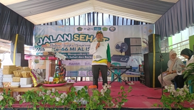Berjubel peserta dan UMKM yang memenuhi jalan di depan madrasah. Mereka ikut menyemarakkan jalan sehat dan mempromosikan produk UMKM mereka, hingga promosi lembaga pendidikan. Khoiriyatul Mar’ah, S.Pd.I, kepala MI Al Ishlah menyemangati peserta dalam pidato yang disampaiakan.